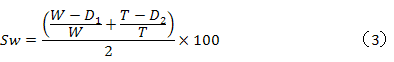 通過端面心材中心量心材檢尺徑,以端面尺寸和心材檢尺徑之差與端面尺寸相比(見圖2),用百分率表示,按式(3)計算:
